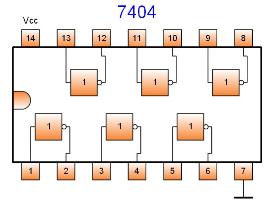 El circuito 7404 integra 6 puertas inversoras con los terminales de alimentación. Este es su aspecto: ![]() Circuito integrado 7404 Para utilizar una de estas puertas se debe alimentar el circuito a 5 Voltios y conectar los terminales de dicha puerta. Cada una de ellas es independiente del resto. Existen otras puertas que son combinación de las anteriores, la NOR y la NAND, que también se comercializan. | |||||||||||||||