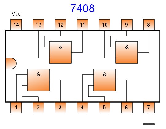 Por otra parte el circuito 7408 integra también cuatro puertas, pero ahora multiplicación (AND) y sus terminales de alimentación. Este es su aspecto: ![]() Circuito integrado 7408 | |||||||||||||||
