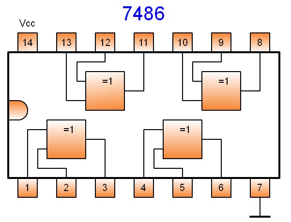 Su símbolo actual y el símbolo antiguo en desuso es: ![]() Símbolo de la puerta OR-exclusiva y símbolo antiguo, no usar. El circuito 7486 integra cuatro puertas EXOR de dos entradas en un encapsulado de 14 patillas, dos de las cuales son la de alimentación +5V(14) y masa (7). El aspecto de dicho integrado puede verse a continuación: ![]() Circuito integrado 7486, EXOR A continuación puede verse otro ejemplo. | |||||||||||||||