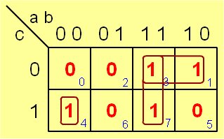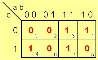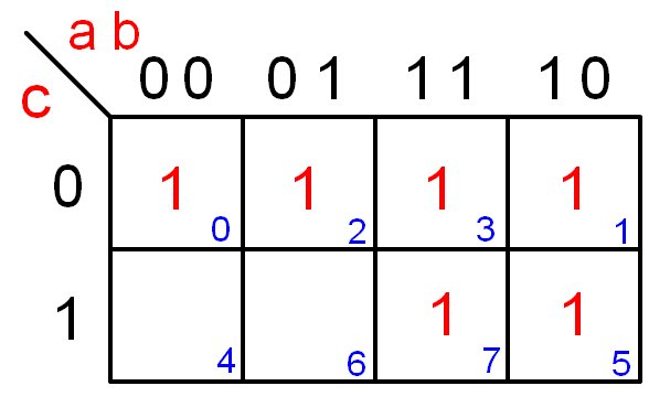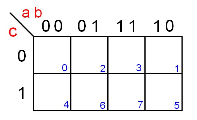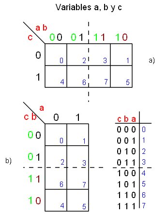 ![]() Mapa de Karnaugh de tres variables a) horizontal, b) vertical | ||||||||||||||||||||||||||||||||||||