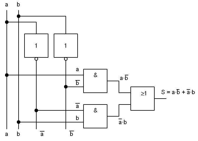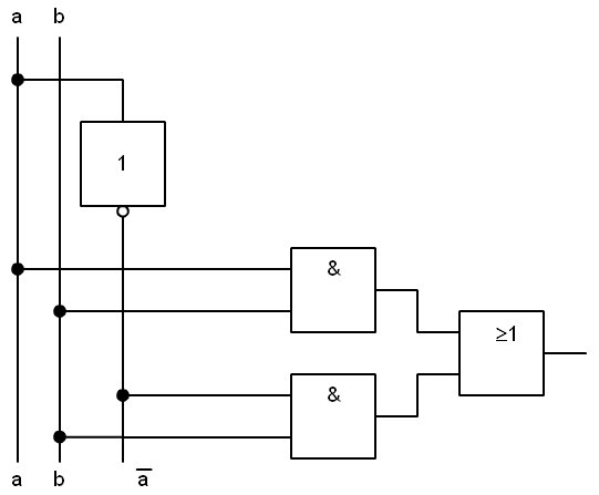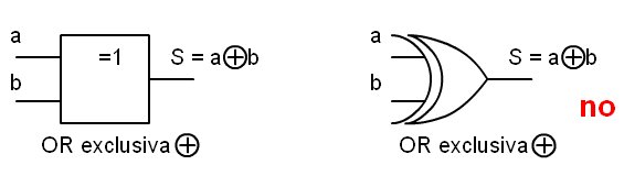 Para implementarla necesitaríamos un circuito 7404 (2 puertas inversoras), un circuito 7408 (2 puertas AND) y un circuito 7432 (1 puerta OR). Total 5 puertas en 3 CI. La función anterior también se encuentra integrada en un circuito electrónico y se la conoce con el nombre de or-exclusiva (EXOR). Función or-exclusiva o (EXOR): ![]() La función toma valor lógico "1" cuando a o b valen "1" y toma el valor lógico "0" cuando a y b son iguales. Su tabla de verdad es: