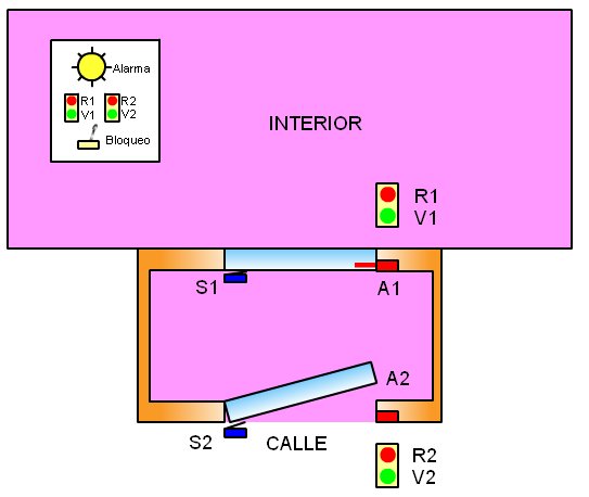 18.- El gráfico siguiente muestra las puertas de entrada de un banco. ![]() Las puertas están provistas de anclajes de seguridad (A1, A2) y de sensores (S1,S2) que indican si están abiertas o cerradas. Así como de un semáforo que indica si se permite o no el paso (R1,V1) y (R2,V2). Cuando se abre una de las puertas se debe cerrar el anclaje de la otra, y encender las luces de los semáforos de manera que impida el paso a las personas que intentan entrar por la otra puerta. Si se produce el caso indeseado de que se abran las dos puertas a la vez se debe indicar con una luz de alarma al cajero. Y no deben activarse los anclajes. El cajero tiene un mando donde se visualiza el estado de las puertas y un interruptor que las bloquea cuando están cerradas. Diseña el sistema que resuelve el problema con puertas de todo tipo, NAND y NOR, he indica cuál es el que debemos montar. |