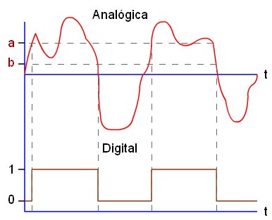 Una señal analógica es aquella que puede tener infinitos valores, positivos y/o negativos. Mientras que la señal digital sólo puede tener dos valores 1 o 0. En el ejemplo de la figura, la señal digital toma el valor 1 cuando supera al valor a, y toma valor 0 cuando desciende por debajo del valor b. Cuando la señal permanece entre los valores a y b, se mantiene con el valor anterior. Esto supone una gran ventaja, hace que la señal digital tenga un alto grado de inmunidad frente a variaciones en la transmisión de datos. Pero tiene el inconveniente de que para transmitir una señal analógica debemos hacer un muestreo de la señal, codificarla y posteriormente transmitirla en formato digital y repetir el proceso inverso. Para conseguir obtener la señal analógica original todos estos pasos deben hacerse muy rápidamente. Aunque los sistemas electrónicos digitales actuales trabajan a velocidades lo suficientemente altas como para realizarlo y obtener resultados satisfactorios. El muestreo de una señal consiste en convertir su valor en un valor binario, por lo que es necesario estar familiarizado con los sistemas de numeración. |