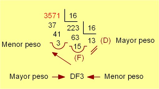 Por ejemplo: a) El número 3571 en base decimal, lo podemos expresar: ![]() 3571 en base 10 = DF3 en base 16 | |||||||||||||||||||||||||||||||||||||||||||||||||||