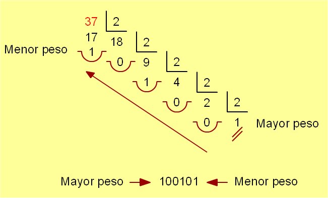 Por ejemplo: a) El número 37 en base decimal, lo podemos expresar: ![]() 37 en base 10 = 100101 en base 2 |