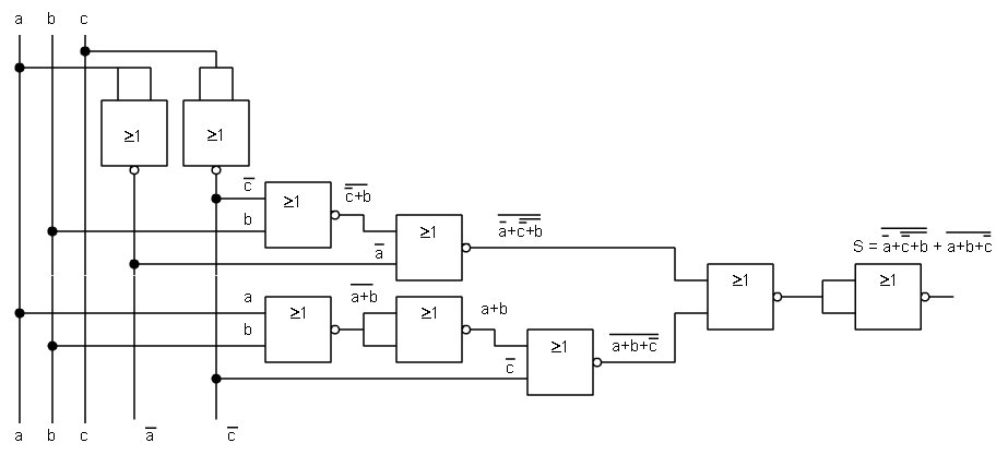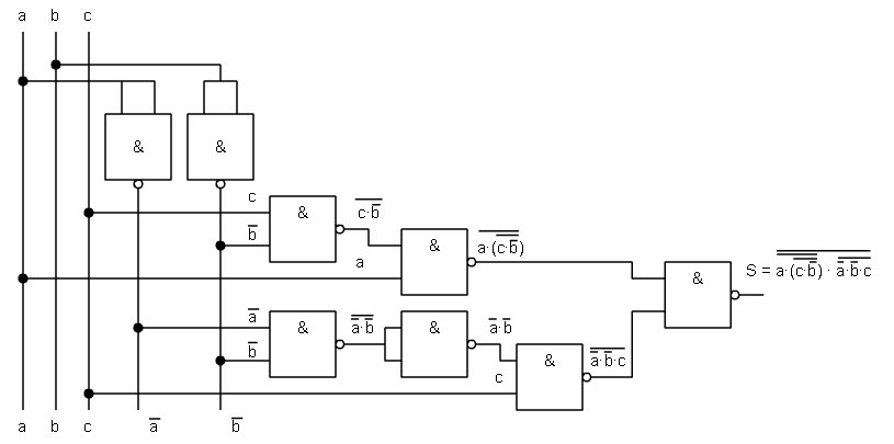 Ejemplo, dada la función 1.- Hacemos una doble inversión en toda la función. ![]() 2.- Aplicamos el teorema de Demorgan sobre la inversión de bajo y convertir la negación de términos sumados en la multiplicación de términos negados. ![]() 3.- Para eliminar la suma del interior del paréntesis realizamos la doble inversión del paréntesis. ![]() 4.- Aplicamos el teorema de Demorgan sobre la inversión inferior del paréntesis y con ello se cambia la suma por una multiplicación. ![]() 5.- Ahora eliminamos la doble inversión de la variable c y ya está. ![]() |