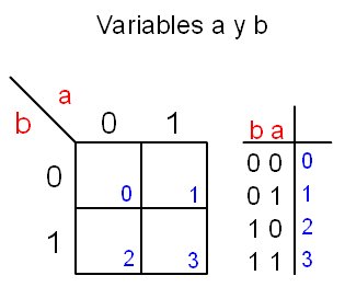 ![]() Mapa de Karnaugh de dos variables | ||||||||||||||||||||||||||||||||||||
