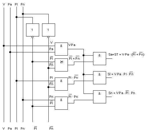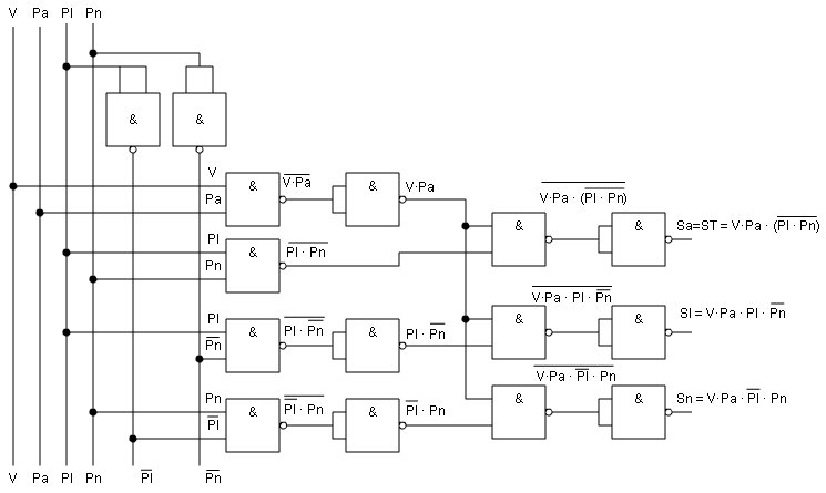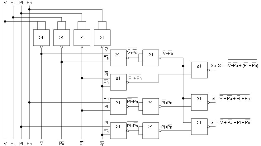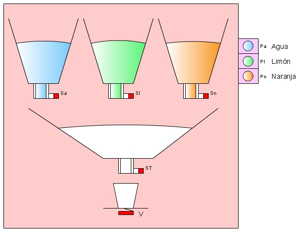 Una máquina expendedora de refrescos puede suministrar agua fresca, agua con limón y agua con naranja. Pero no puede suministrar nunca limón solo, naranja sola, ni limón con naranja solos o con agua. Los refrescos se encuentran en el interior de unos depósitos. La cantidad adecuada de cada líquido sale cuando se activa la electroválvula correspondiente, Sa (agua), Sl (limón), Sn (naranja). Y una vez caído el líquido sale hasta el vaso si está activada la salida general (ST), y se encuentra el vaso en su sitio (V). Para seleccionar el líquido que queremos tenemos tres pulsadores Pa (agua), Pl (limón) y Pn (naranja). Deben pulsarse uno o dos según lo que deseemos, pero recordar que si se pulsan los que no corresponde no debe salir nada. Diseñar el circuito digital capaz de resolver el problema y elegir aquel capaz de resolver el problema con mayor prontitud y menor coste. | ||||||||||||||||||||||||||||||||||||||||||||||||||||||||||||||||||||||||||||||||||||||||||||||||||||||||||||||||||||||||||||||||||||||||||||||||