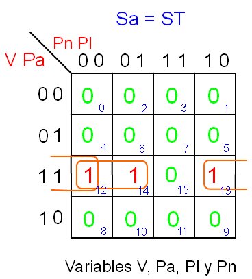 1.- Identificar entradas y salidas: Entradas, serán los pulsadores Pa, Pl, Pn y el sensor que detecta la presencia del vaso V. Puesto que el problema no especifica nada entendemos que un pulsador pulsado será "1" y no pulsado será "0". Cuando hay vaso V será "1" y cuando no hay vaso V será "0". Salidas, serán todas las electroválvulas sobre las que hay que actuar, Sa, Sl, Sn y ST. Como tampoco se dice nada al respecto cuando la electroválvula en cuestión valga "1" permitirá que salga la cantidad de líquido necesario. 2.- Crear la tabla de verdad. Como existen cuatro entradas y cuatro salidas deberíamos crear cuatro tablas de verdad una para cada salida. Pero para simplificar y dar una visión más general, sobre una misma tabla de verdad vamos a colocar las cuatro salidas, que se deben resolver de forma independiente cada una de ellas. Luego la tabla debe tener 24 combinaciones = 16. Si elegimos la variable de entrada de existencia de vaso la de mayor peso, luego la de agua y luego las otras dos tendremos una visión más fácil del problema. El orden de situación de las salidas no importa puesto que son independientes. | ||||||||||||||||||||||||||||||||||||||||||||||||||||||||||||||||||||||||||||||||||||||||||||||||||||||||||||||||||||||||||||||||||||||||||||||||