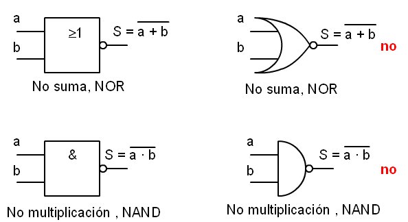 ![]() Símbolo de las puertas NAND y NOR, actual y antiguo en desuso Este es el aspecto de los circuitos que las contienen: ![]() Circuito integrado 7402, NOR ![]() Circuito integrado 7400, NAND | |||||||||||||||