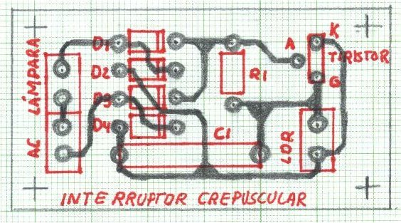 Partiendo de los componentes: D1 = 1N4004 a 1N4007.D2 = 1N4004 a 1N4007. D3 = 1N4004 a 1N4007. D4 = 1N4004 a 1N4007. R1 = 1M potencia 1/4 W (1.000.000 ohmios). C1 = 470k tensión 400V (470nF). TIRISTOR (SCR) = BT 106 o C106D1. LDR = Resistencia dependiente de la luz. 3 Regletas para circuito impreso de dos terminales. Placa de circuito impreso de dimensiones 67 x 36 mm. |