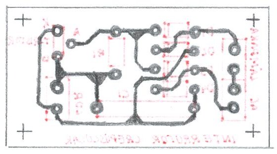 Puede realizarse el diseño de forma mecánica en lugar de manual, con ayuda de programas específicos para este fin como lo son OrCAD, Tango u otros. A continuación puede verse como quedaría el diseño con un programa de este tipo. La terminación es mucho mejor y más completa. La dimensión real de la placa para este caso es 60 x 40 mm. | |