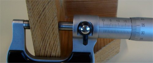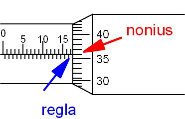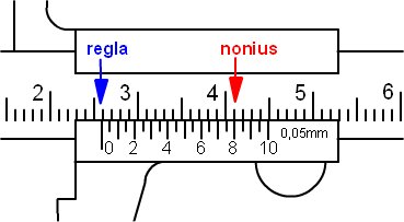 Otro ejemplo: En la figura anterior, la parte de la regla indica 36,5 mm, la parte de precisión del nonius que coincide con la línea central marca 0,37mm La medición será: Parte de la regla, 36,5 mm. Parte de precisión 0,37 mm La medición completa es 36,87 mm. |