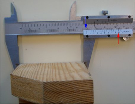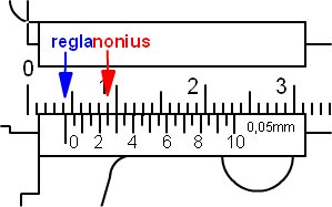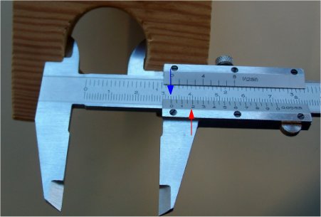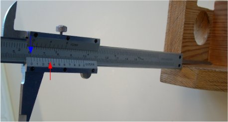 Ejemplo: En la figura anterior, el cero del nonius está entre los 32 y 33 mm y la línea del nonius que coincide con la regla es el 2. La medición será: Parte entera, 32 mm. Parte decimal 0,20 mm La medición completa es 32,20 mm. |