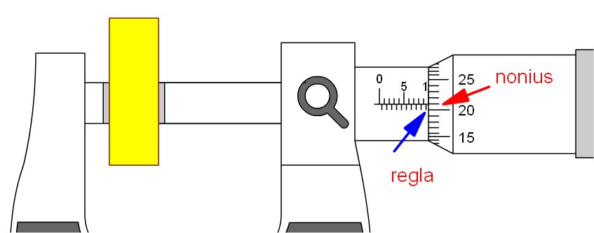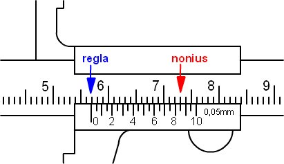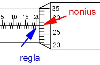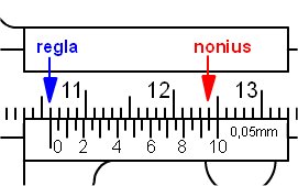 Ejemplo: En la figura anterior, la parte de la regla indica 19 mm, la parte de precisión del nonius que coincide con la línea central marca 0,33mm La medición será: Parte de la regla, 19 mm. Parte de precisión 0,33 mm La medición completa es 19,33 mm. |