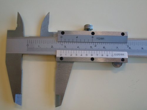 Otro ejemplo Haz la lectura de Pie de Rey siguiente. ![]() En la figura anterior, el cero del nonius está entre los 60 y 61 mm y la línea del nonius que coincide con la regla es el 3,5. La medición será: Parte entera, 56 mm. Parte decimal 0,85 mm La medición completa es 56,85 mm. |