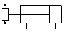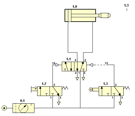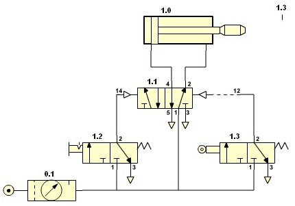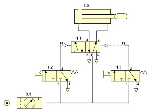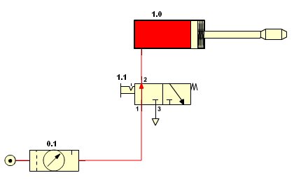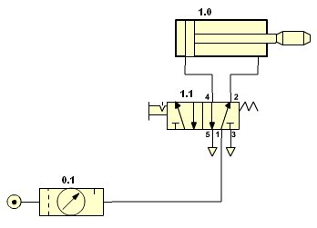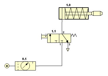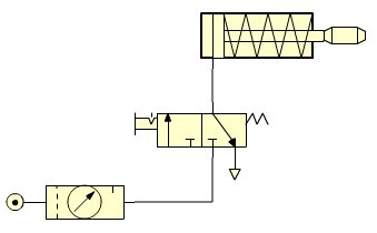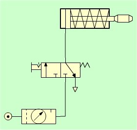 Un ejemplo de circuito completo con los símbolos normalizados es el siguiente. ![]() Circuito neumático Contiene una toma de presión, unidad de mantenimiento, escape con rosca, válvula 3/2 activa de forma manual con bloqueo y retorno por muelle, cilindro de simple efecto con retorno por muelle y todos ellos unidos por tuberías. | ||||||||||||||||||||||||||||||||||||||||||||||||||||||||||||||||||||||||||||||||||||||||||||||||||||||||||||||||||||||||||||||||||||