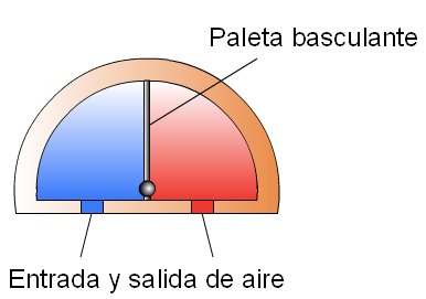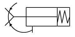 Los actuadores rotativos se utilizan para hacer girar objetos o máquinas herramientas, motor de una taladradora, atornillar y destornillar, etc. También se utilizan los cilindros basculantes para producir movimientos circulares alternativos. Motor de paletas: genera movimiento rotativo continuo. El aire entra por una parte y hace que giren las paletas, la herramienta se encuentra sujeta sobre el eje de giro. Se trata del motor neumático más utilizado, puede dar una potencia de hasta 20 CV y velocidades desde 3000 a 25000 rpm. ![]() Motor de paletas ![]() Símbolo del motor de un sentido de giro ![]() Motor de paletas de dos sentidos de giro ![]() Símbolo del motor de dos sentidos de giro Cilindro basculante: genera movimiento alternativo en una dirección u otra. Se trata de un cilindro con dos entradas de aire que hacen mover una paleta que contiene un eje de giro al cual está sujeto el objeto que queremos mover, por ejemplo un limpia parabrisas. ![]() Cilindro basculante ![]() Símbolo del cilindro basculante | |