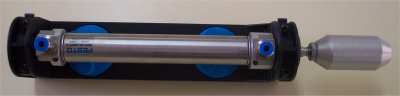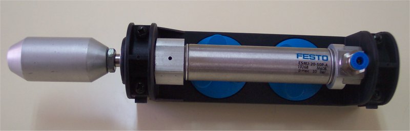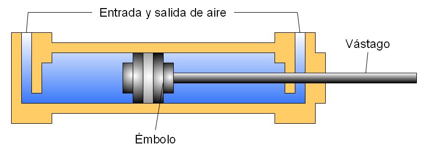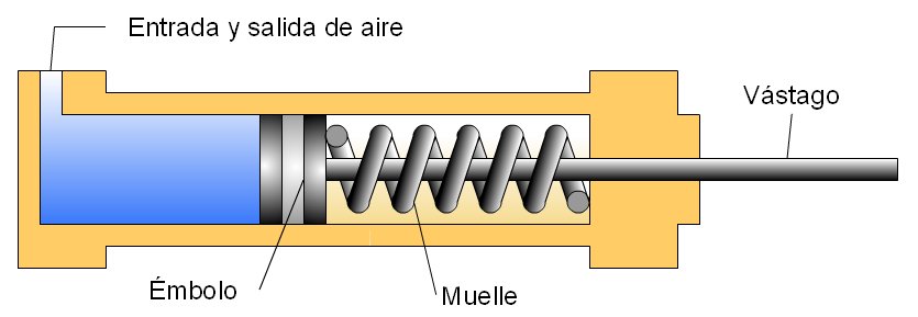 Los actuadores se pueden clasificar en dos tipos lineales y rotativos. Entre los actuadores lineales destacan los cilindros. Los cilindros se emplean cuando se desea un movimiento rectilíneo alternativo. Pueden utilizarse para desplazar objetos, para mover brazos de robots, etc. Los más conocidos son los de simple efecto y los de doble efecto. Cilindro de simple efecto: se trata de un tubo cilíndrico cerrado dentro del cual hay un émbolo unido a un vástago que se desplaza unido a él. Por un extremo hay un orificio para entrar o salir el aire y en el otro está albergado un muelle que facilita el retorno del vástago. Este tipo de cilindro trabaja en un solo sentido, cuando el aire entra en él. El retroceso y desalojo del aire se produce por la fuerza del melle que está albergado en el interior del cilindro. La fuerza de empuje que realiza hacia fuera el vástago corresponde con la fórmula. Fuerza = Presión del aire * Superficie del émbolo - Fuerza del muelle ![]() Cilindro de simple efecto retorno por muelle ![]() Símbolo del cilindro de simple efecto retorno por muelle ![]() Foto de un cilindro de simple efecto retorno por muelle Cilindro de doble efecto: se trata de un tubo cilíndrico cerrado con un diseño muy parecido al cilindro de simple efecto, pero sin el muelle de retorno, el retorno se hace por medio de otra entrada de aire. Este tipo de cilindro trabaja en los dos sentidos, cuando el aire entra en él produce fuerza y desaloja el aire que está en el otro compartimento. El retroceso y desalojo del aire se produce cuando el aire entra por el otro orificio. ![]() Cilindro de doble efecto ![]() Símbolo del cilindro de doble efecto ![]() Foto de un cilindro de doble efecto La fuerza de empuje que realiza hacia fuera el vástago corresponde con la fórmula. Fuerza = Presión del aire * Superficie del émbolo La fuerza de empuje de retroceso que realiza hacia dentro el vástago corresponde con la fórmula. Fuerza = Presión del aire * (Superficie del émbolo - Superficie del vástago) De manera que la fuerza que podemos obtener de retorno es menor que la de empuje hacia fuera.