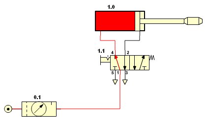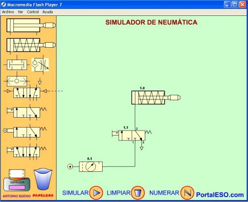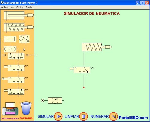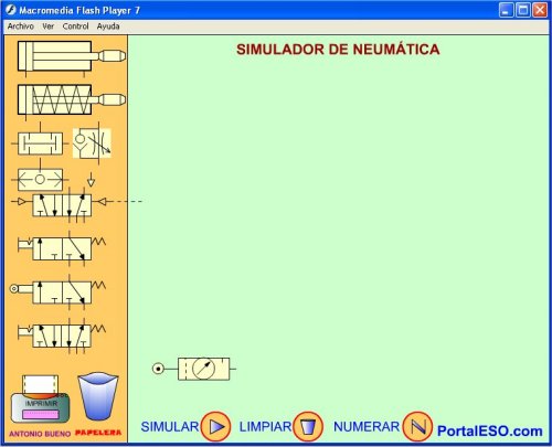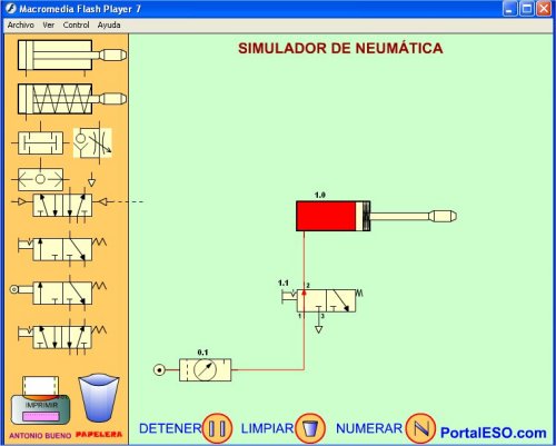 Los simuladores de neumática son muy útiles por que nos ayudan a comprender el funcionamiento de los circuitos neumáticos. En la actualidad hay muchos en el mercado, pero su elevado coste los hace de difícil adquisición. Un simulador comercial es el Automation Studio, el aspecto de este simulador es: ![]() Aspecto del simulador Automation Studio Dispone de muchas posibilidades, tanto en el diseño como a la hora de la simulación. Su utilización excede el objetivo de esta unidad. Existe otro simulador de libre utilización que permite simular pequeños circuitos neumáticos. Si el circuito es muy grande en ocasiones no funciona bien. Se encuentra en la web educativa PortalESO (Portal Educativo) situada en la url www.portaleso.com, en la asignatura de tecnología, sección neumática. Su aspecto es: ![]() Aspecto del simulador de PortalESO (Portal Educativo) Los distintos componentes se pueden desplazar hasta el área de trabajo, y allí con ayuda del ratón situándonos sobre el terminal, aparece un punto rojo indicando que puede salir el conducto para unir los terminales hasta completar el esquema. ![]() Montando el esquema en el simulador de PortalESO Una vez completado se puede ver u ocultar su numeración y realizar la simulación del circuito. ![]() Numerando el esquema en el simulador de PortalESO ![]() La simulación del esquema en el simulador de PortalESO Para poder quitar o añadir nuevos elementos la simulación debe estar detenida. Y puede limpiare todo el área de simulación o eliminar tanto conductos como componentes. |