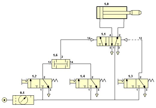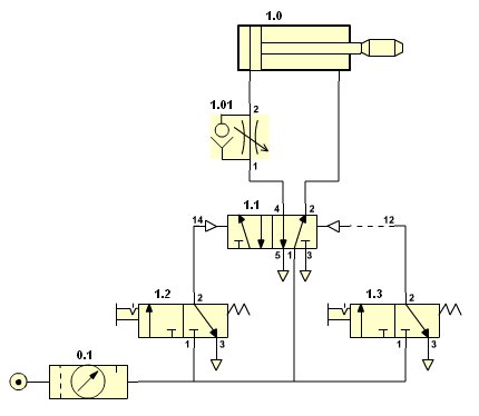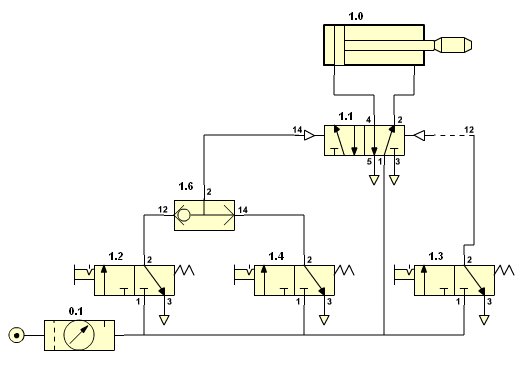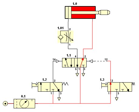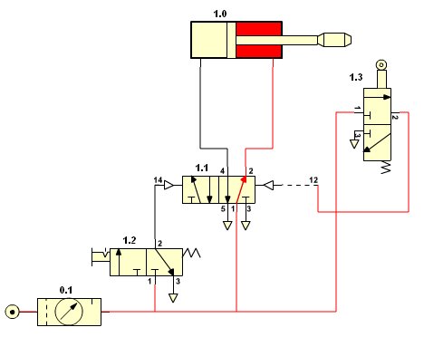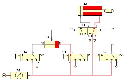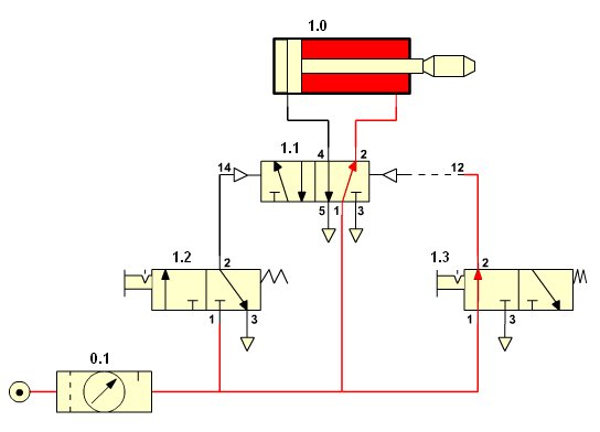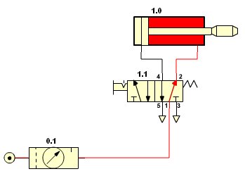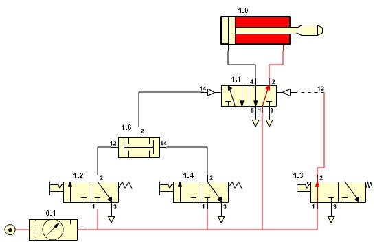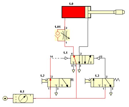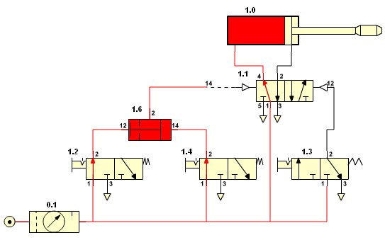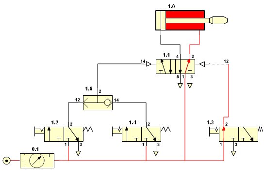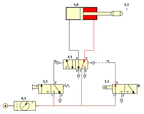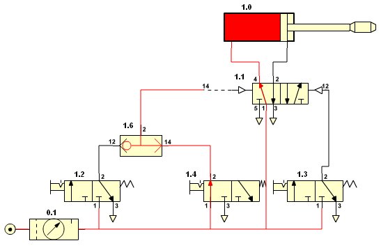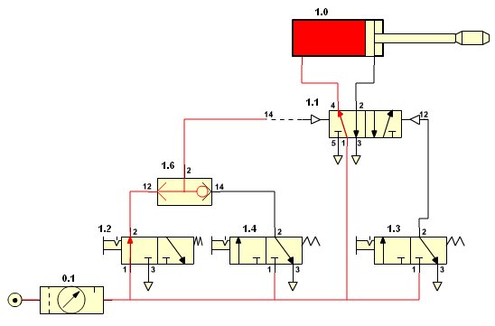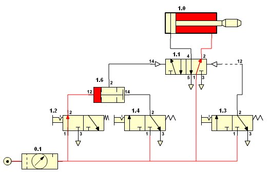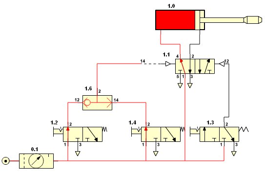 A continuación se representan algunas aplicaciones básicas que ayudarán a entender los circuitos neumáticos. 1.- Control de un cilindro de simple efecto. ![]() Control de un cilindro de simple efecto ![]() Cilindro de simple efecto activo Los elementos que componen este circuito son: 0.1 - Unidad de mantenimiento. 1.1 - Válvula 3/2 con enclavamiento. 1.0 - Cilindro de simple efecto. En el estado de reposo, el aire sale de la unidad de mantenimiento hasta la válvula 3/2 sin superarla. Cuando activamos la válvula el aire llega hasta el cilindro de simple efecto y hace que se desplace el vástago. Cuando desenclavamos la válvula el muelle la hace retornar y el cilindro de simple efecto vuelve a su posición inicial expulsando el aire a través del orificio 3 de la válvula 3/2. 2.- Pulsador con enclavamiento y cilindro de doble efecto. ![]() Cilindro de doble efecto ![]() Cilindro de doble efecto activo ![]() Cilindro de doble efecto retorno Los elementos que componen este circuito son: 0.1 - Unidad de mantenimiento. 1.1 - Válvula 5/2 con enclavamiento. 1.0 - Cilindro de doble efecto. En el estado de reposo, el aire sale de la unidad de mantenimiento hasta la válvula 5/2, entrando en el cilindro y haciendo que este, se encuentre retraído. Cuando se activa la válvula 5/2, el aire entra por la parte inferior del cilindro y hace que salga el vástago. Cuando se desactiva la válvula 5/2, el vástago vuelve a su estado de reposo impulsado por el aire. 3.- Pulsador de avance y de retroceso, con cilindro de doble efecto. ![]() Cilindro de doble efecto con pulsador de avance y de retroceso ![]() Cilindro de doble efecto con pulsador de avance y de retroceso, en avance ![]() Cilindro de doble efecto con pulsador de avance y de retroceso, en retroceso Los elementos que componen este circuito son: 0.1 - Unidad de mantenimiento. 1.1 - Válvula 5/2 activa y retorno por presión. 1.2 - Válvula 3/2 con enclavamiento, para el avance. 1.3 - Válvula 3/2 con enclavamiento, para el retorno. 1.0 - Cilindro de doble efecto. En el estado de reposo, el cilindro se encuentra retraido, cuando se activa la válvula 1.2 el aire llega hasta la entrada 14 de la válvula 1.1 y la activa. Ésta conduce el aire hasta el cilindro hace avanzar, al vástago. Dejamos de pulsar la válvula 1.2, y el cilindro permanece en este estado. Cuando activamos la válvula 1.3, ésta conduce el aire hasta la entrada 12 de la válvula 1.1, y hace que el vástago se retraiga. 4.- Utilización de la válvula estranguladora de caudal. La válvula estranguladora unidireccional de caudal se utiliza para hacer que el aire abandone al cilindro lentamente, y así hacer que el retroceso o el avance del vástago se realice lentamente. ![]() Cilindro de doble efecto con regulación de velocidad en el retorno ![]() Cilindro de doble efecto con regulación de velocidad en el retorno, avance ![]() Cilindro de doble efecto con regulación de velocidad en el retorno, retroceso Los elementos que componen este circuito son: 0.1 - Unidad de mantenimiento. 1.1 - Válvula 5/2 activa y retorno por presión. 1.2 - Válvula 3/2 con enclavamiento, para el avance. 1.3 - Válvula 3/2 con enclavamiento, para el retorno. 1.0 - Cilindro de doble efecto. 1.01 - Válvula estranguladora de caudal. Cuando se activa la válvula 1.2, el aire llega hasta el cilindro por la válvula estranguladora 1.01, pero esta no opone ninguna resistencia al paso del aire y el vástago sale con total normalidad. Cuando se pulsa la válvula 1.3 para que retorne, el aire que abandona al cilindro por la válvula 1.01, sale por la estrangulación y hace que el vástago retorne lentamente. 5.- Utilización de un final de carrera. ![]() Cilindro de doble efecto con retorno automático por final de carrera ![]() Cilindro de doble efecto con retorno automático por final de carrera, retornando ![]() Cilindro de doble efecto con retorno automático por final de carrera, simulación Los elementos que componen este circuito son: 0.1 - Unidad de mantenimiento. 1.1 - Válvula 5/2 activa y retorno por presión. 1.2 - Válvula 3/2 con enclavamiento, para el avance. 1.3 - Válvula 3/2 con final de carrera, para el retorno. 1.0 - Cilindro de doble efecto. El funcionamiento es el mismo que la aplicación 3, pero el retorno se produce cuando el vástago llega hasta el final de carrera 1.3 de la válvula 1.3, de forma automática. Con el simulador de PortalESO, se puede realizar la simulación colocando la válvula 1.3 junto al vástago del cilindro. 6.- La puerta OR. ![]() Cilindro de doble efecto con una puerta OR para el avance ![]() Cilindro de doble efecto con una puerta OR para el avance, activo ![]() Cilindro de doble efecto con una puerta OR para el avance, activo ![]() Cilindro de doble efecto con una puerta OR para el avance, activo ![]() Cilindro de doble efecto con una puerta OR para el avance, retorno Los elementos que componen este circuito son: 0.1 - Unidad de mantenimiento. 1.1 - Válvula 5/2 activa y retorno por presión. 1.2 - Válvula 3/2 con enclavamiento, para el avance. 1.4 - Válvula 3/2 con enclavamiento, para el avance. 1.3 - Válvula 3/2 con enclavamiento, para el retorno. 1.6 - Válvula OR. 1.0 - Cilindro de doble efecto. Cuando se pulsa la válvula 1.2 o 1.4, o las dos, se hace que avance el cilindro. Si no están pulsadas ninguna de las dos, y pulsamos la válvula 1.3, el cilindro retorna. La válvula 1.6 implementa la función OR. 7.- La puerta AND. ![]() Cilindro de doble efecto con una puerta AND para el avance ![]() Cilindro de doble efecto con una puerta AND para el avance ![]() Cilindro de doble efecto con una puerta AND para el avance ![]() Cilindro de doble efecto con una puerta AND para el avance, activo ![]() Cilindro de doble efecto con una puerta AND para el avance, retorno Los elementos que componen este circuito son: 0.1 - Unidad de mantenimiento. 1.1 - Válvula 5/2 activa y retorno por presión. 1.2 - Válvula 3/2 con enclavamiento, para el avance. 1.4