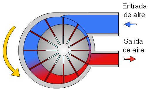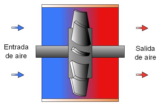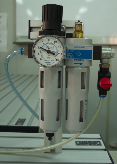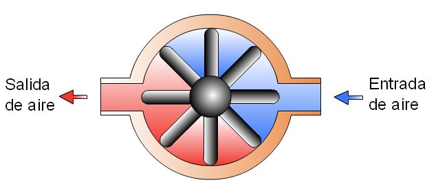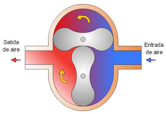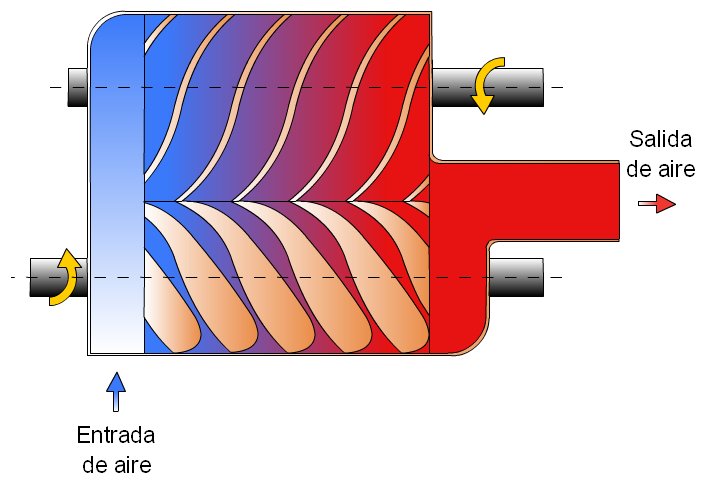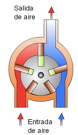 Para la producción se utilizan los compresores. Estos se pueden clasificar en dos tipos, de émbolo o rotativos. · Compresores de émbolo, son los más utilizados debido a su flexibilidad de funcionamiento. ![]() Compresor de émbolo El funcionamiento de este tipo de compresores es muy parecido al del motor de un automóvil. Un eje, mediante una biela y una manivela produce el movimiento alternativo de un pistón. Al bajar el pistón se introduce el aire. Cuando ha bajado totalmente se cierra la válvula de admisión y comienza a subir el pistón y con ello la compresión del aire. Cuando este aire se ha comprimido hasta el máximo, la válvula de escape se abre y sale el aire a presión. Generalmente con una sola etapa se obtiene poca presión por lo que suelen concatenarse varias etapas para obtener mayores presiones. · Compresores rotativos, consiguen aumentar la presión mediante el giro de un rotor. El aire se aspira y se comprime en la cámara de compresión gracias a la disminución del volumen que ocupa el aire. Los hay de paletas, de tornillo y el turbocompresor. Compresor de paletas: Son muy silenciosos y proporcionan un nivel de caudal prácticamente constante. ![]() Compresor de paletas La compresión se efectúa como consecuencia de la disminución del volumen provocada por el giro de una excéntrica provista de paletas radiales extensibles que ajustan sobre el cuerpo del compresor. Compresor de husillo o Roots: Son caros aunque pueden suministrar aire a mayor presión que los anteriores. ![]() Compresor de husillo o Roots Emplea un doble husillo de forma que toma el aire de la zona de aspiración y lo comprime al reducirse el volumen en la cámara creada entre ellos y el cuerpo del compresor. Compresor de tornillo: Son caros, silenciosos y tienen un desgaste muy bajo. ![]() Compresor de tornillo Se basa en el giro de dos tornillos helicoidales que comprimen el aire que ha entrado en su interior. Turbocompresor: Proporciona una presión reducida pero un caudal muy elevado. No suelen utilizarse en aplicaciones neumáticas industriales. ![]() Turbocompresor axial Las álabes recogen el aire de entrada y lo impulsan hacia la salida aumentando su presión. ![]() Símbolo del compresor La mayor parte de los compresores suministran un caudal discontinuo de aire, de manera que se debe almacenar en un depósito. El depósito a demás sirve para evitar que los compresores estén en funcionamiento constantemente, incluso cuando no se necesita gran caudal de aire, también ayudan a enfriar el aire. Los depósitos generalmente disponen de manómetro que indica la presión interior, una válvula de seguridad que se dispara en caso de sobrepresiones y una espita para el desagüe de las condensaciones que se producen en el interior del depósito. ![]() Símbolo del depósito ![]() Compresor con su depósito Para transportar el aire es necesario utilizar conductores. Los conductores utilizados son tuberías metálicas o de polietileno de presión. El diámetro de las tuberías depende de las necesidades de caudal que requiere la instalación, teniendo en cuenta la caída de presión producida por las pérdidas y la longitud de las tuberías. ![]() Tubo de polietileno de presión Generalmente entre el depósito y el circuito se suele incluir una unidad de mantenimiento que cuenta con un regulador de presión, un filtro y un lubricador de aire. ![]() Símbolo de la unidad de mantenimiento ![]() Foto de la unidad de mantenimiento |