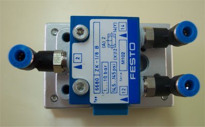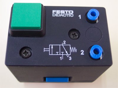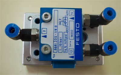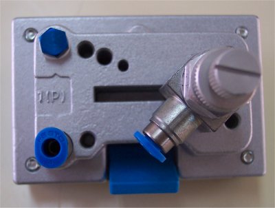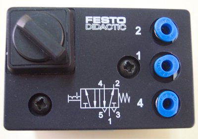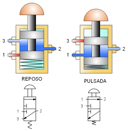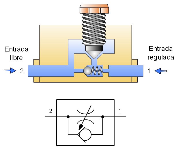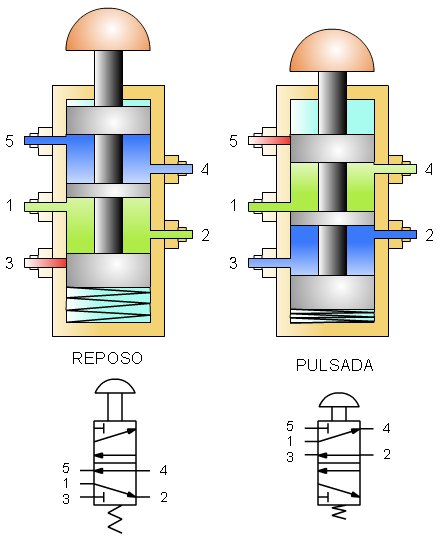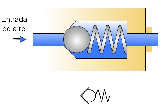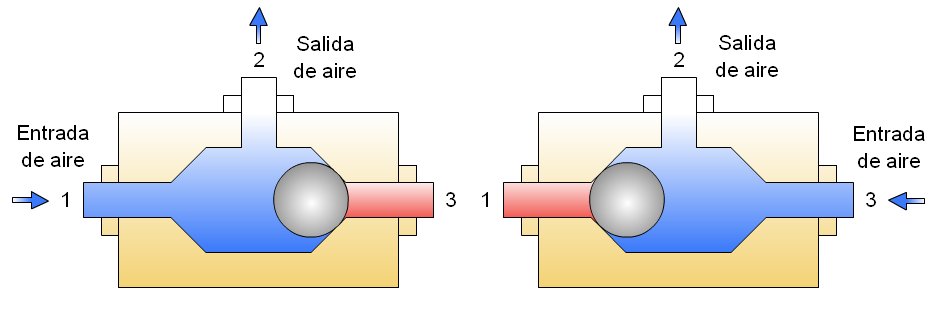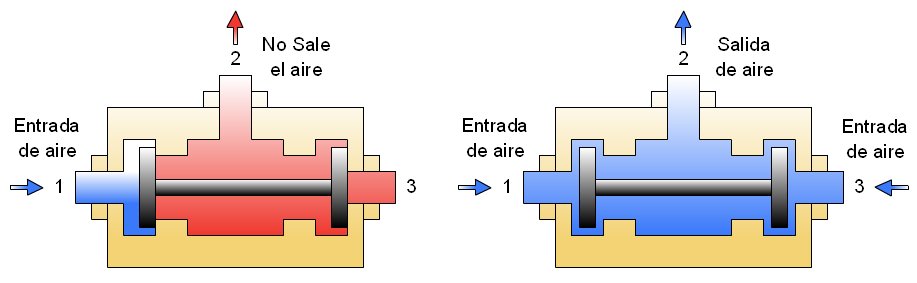 Con el objeto de controlar la circulación del aire en una dirección u otra se necesitan elementos de mando y control. Algunos de estos se describen a continuación: Válvula 3/2: Una de sus principales aplicaciones es permitir la circulación de aire hasta un cilindro de simple efecto, así como su evacuación cuando deja de estar activado. A continuación se ve su constitución interna. Se trata de una válvula activa por un pulsador y retorno por un muelle. En estado de reposo, permite que el aire pase del terminal 2 hasta el 3 y que no pueda entrar por el 1. Cuando la activamos, el aire puede pasar del terminal 1 al 2 y no puede pasar por el 3. ![]() Válvula 3/2 normalmente cerrada ![]() Foto de una válvula 3/2 normalmente cerrada Válvula 5/2: Una de sus principales aplicaciones es controlar los cilindros de doble efecto. A continuación se ve su constitución interna. Se trata de una válvula activa por un pulsador y retorno por muelle. En estado de reposo, permite la circulación de aire entre los terminales 4 y 5, y entre 1 y 2, el terminal 3 está bloqueado. Cuando la activamos, permite la circulación de aire entre los terminales 1 y 4, y entre 2 y 3, ahora el terminal 5 se encuentra bloqueado. ![]() válvula 5/2 ![]() Foto de una válvula 5/2 activa manual, retorno por muelle ![]() Foto de una válvula 5/2 activa y retorno por aire El modelo más utilizado de este tipo de válvula es el activo y retorno con aire. Válvula OR (O): Se trata de una válvula que implementa la función OR, esto es, cuando penetra el aire por cualquiera de sus entradas hace que este salga por la salida. Se utiliza para activar cilindros desde dos lugares distintos. ![]() válvula OR ![]() Símbolo de la válvula OR ![]() Foto de una válvula OR Válvula AND (Y): Se trata de una válvula que implementa la función AND, esto es, sólo permite pasar el aire a la salida cuando hay aire con presión por las dos entradas a la vez. Se utiliza para hacer circuitos de seguridad, el cilindro sólo se activará cuando existe presión en las dos entradas. ![]() válvula AND ![]() Símbolo de la válvula AND ![]() Foto de una válvula AND Válvula antirretorno: Se encarga de permitir el paso del aire libremente cuando circular desde el terminal 2 al 1. Mientras que no permite circular el aire desde el terminal 1 al 2. ![]() válvula antirretorno Válvula estranguladora unidireccional: Se encarga de permitir el paso del aire libremente cuando circular desde el terminal 2 al 1. Mientras que estrangula el aire cuando circula desde el terminal 1 al 2. Se utiliza para hacer que los cilindros salgan o entren más lentamente. ![]() válvula estranguladora unidireccional ![]() Foto de una válvula estranguladora unidireccional |