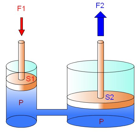 Cuando el fluido que utilizamos no es el aire, si no un líquido que no se puede comprimir, agua, aceite, u otro. Los fundamentos físicos de los gases se cumplen considerando el volumen constante. Una consecuencia directa de estos fundamentos es el Principio de Pascal, que dice así: Cuando se aplica presión a un fluido encerrado en un recipiente, esta presión se transmite instantáneamente y por igual en todas direcciones del fluido. ![]() Principio de Pascal Como aplicación podemos ver como dos pistones unidos mediante un fluido encerrado, si le aplicamos una fuerza (F1) a uno de ellos, se transmite la presión hasta el otro, y produce una fuerza (F2) en el segundo. Las ecuaciones que rigen este principio son: P = F1/S1 y P = F2/S2 Donde: P = presión, F = fuerza, S = superficie. Por lo que podemos poner F1/S1 = F2/S2 otra forma de expresarlo es: F1*S2 = F2 * S1 Nos dice que en un pistón de superficie pequeña cuando aplicamos fuerza, esta se transmite al pistón de superficie grande amplificada o a la inversa.