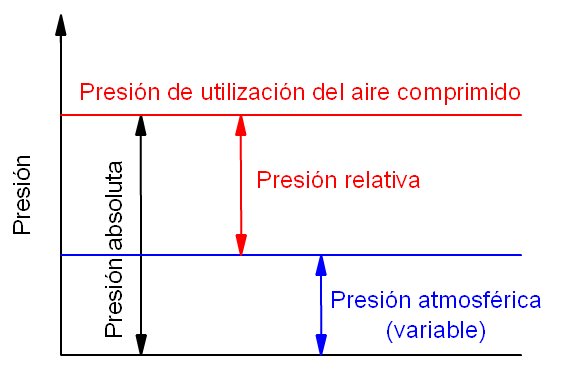 El aire comprimido que se emplea en la industria procede del exterior. Se comprime hasta alcanzar una presión de unos 6 bares de presión, con respecto a la atmosférica (presión relativa). Presión absoluta = P. atmosférica + P. relativa ![]() Presión absoluta, relativa y atmosférica Los manómetros indican el valor de presión relativa que estamos utilizando. Para su estudio se considera como un gas perfecto. Las ventajas que podemos destacar del aire comprimido son: - Es abundante (disponible de manera ilimitada).- Transportable (fácilmente transportable, además los conductos de retorno son innecesarios). - Se puede almacenar (permite el almacenamiento en depósitos). - Resistente a las variaciones de temperatura. - Es seguro, antideflagrante (no existe peligro de explosión ni incendio). - Limpio (lo que es importante para industrias como las químicas, alimentarias, textiles, etc.). - Los elementos que constituyen un sistema neumático, son simples y de fácil comprensión). - La velocidad de trabajo es alta. - Tanto la velocidad como las fuerzas son regulables de una manera continua. - Aguanta bien las sobrecargas (no existen riesgos de sobrecarga, ya que cuando ésta existe, el elemento de trabajo simplemente para sin daño alguno). Las mayores desventajas que posee frente a otros tipos de fuente de energía, son: - Necesita de preparación antes de su utilización (eliminación de impurezas y humedad).- Debido a la compresibilidad del aire, no permite velocidades de los elementos de trabajo regulares y constantes. - Los esfuerzos de trabajo son limitados (de 20 a 30000 N). - Es ruidoso, debido a los escapes de aire después de su utilización. - Es costoso. Es una energía cara, que en cierto punto es compensada por el buen rendimiento y la facilidad de implantación. La composición aproximada en volumen es: N2=> 78,084%; O2=> 20,9476%; CO2 => 0,0314%; Ne => 0,00181%; He => 0,000524%; CH4 => 0,0002%; SH4 => de 0 a 0,0001%; H2 => 0,00005% y una serie de componentes minoritarios (Kr, Xe, O3) => 0,0002%. |