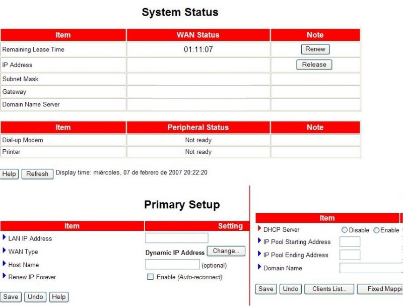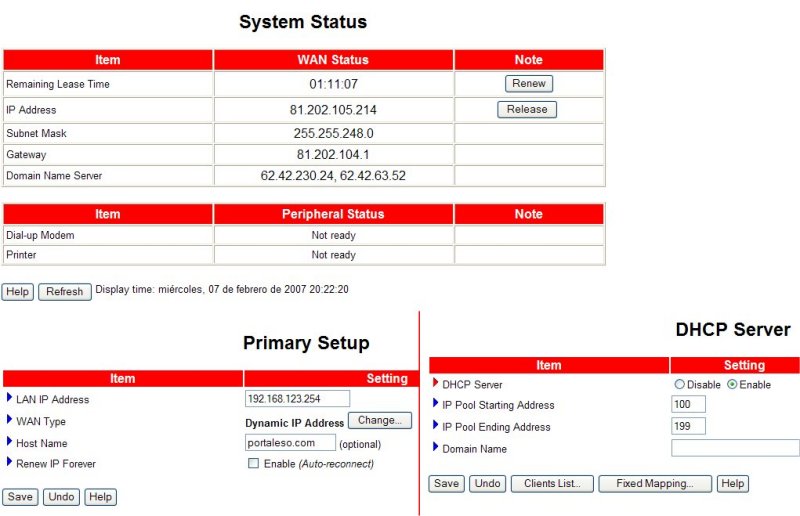 Para configura la red correctamente debemos configurar el Router por una parte y las estaciones por otra. En cada estación debemos configurar su IP, el valor de la máscara de red, la puerta de enlace y las direcciones de los DNS, que pueden ser dos. Configuración de cada ordenador:IP de cada ordenador distinta ....... 192.168.123.10 Máscara de red igual en todos ....... 255.255.255.0 Puerta de enlace, la IP del Router .... 192.168.123.254 DNS pueden ser dos ....................... 62.42.230.135 ....................... 62.42.230.136 Existe una forma más simple de configurarla y es dejar que el Router suministre la IP a cada estación, para ello debe activarse el DHCP del Router e indicarse en cada estación que es el Router quien suministrará la IP y el resto de datos. En el Router debe configurarse la parte de conexión a la LAN y la parte de configuración a la WAN. Configuración del router:IP del WAN del Router acceso a Inet ....... 81.202.105.214 Máscara de red del Router acceso a Inet ....... 255.255.248.0 Puerta de enlace, Gateway .... 81.202.104.1 DNS pueden ser dos ....................... 62.42.230.24 ....................... 62.42.63.5 ---------------------------------------------------------------------------- IP en la LAN del Router IP del Router ....... 192.168.123.254 DHCP server Servidor de IPs automático ....... Enable Si deseamos que se encargue el Router de servir las IP de las estaciones debemos habilitar (enable) el DHCP en caso contrario debe estar deshabilitado (disable). Por defecto suele estar habilitado. | |