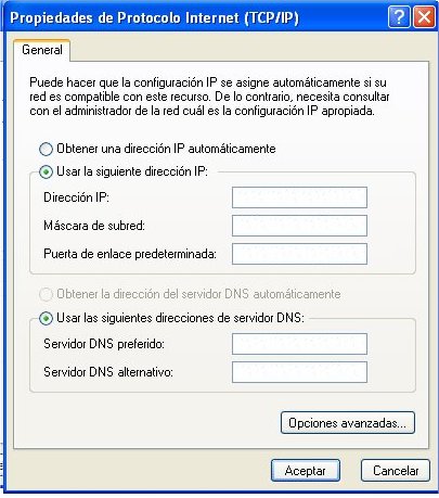En Windows XP, podemos configurar el ordenador con el asistente de Windows o mediante los siguientes pasos: 1º- Pulsar sobre el botón Inicio de Windows.2º- Seleccionar la opción panel de control. 3º- Hacer clic sobre el enlace ![]() 4º- Hacer clic sobre el icono del adaptador de red con el botón derecho y seleccionar propiedades. ![]() Configuración de un ordenador bajo Windows XP 5º- Selecciona el Protocolo Internet (TCP/IP).6º- y pulsa sobre Propiedades. 7º- En la pestaña general puedes introducir los valores de la IP, máscara de red, puerta de enlace (la dirección IP del Router) y los DNS. O bien que se encargue el Router de suministrar todos los datos. Con esto queda configurado el ordenador. | |