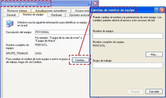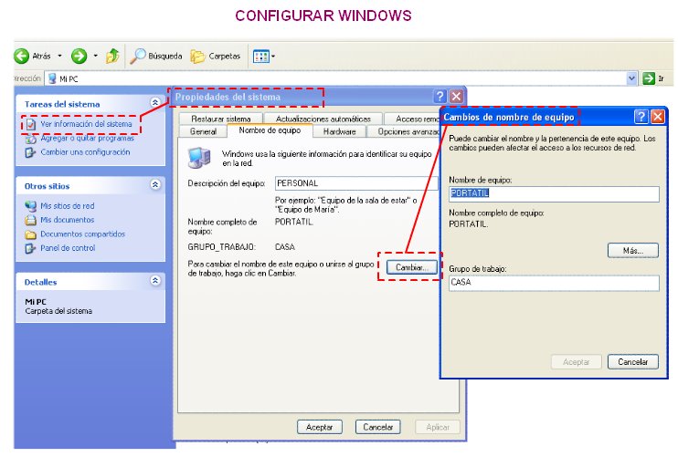 Para compartir los recursos en primer lugar es necesario configurar Windows. Esto se consigue siguiendo los siguientes pasos: 1º- Hacer clic sobre el icono Mi PC. 2º- Seleccionar ver información del sistema. 3º- Dentro de las propiedades de sistema, selecciona la pestaña, Nombre de equipo. 4º- Haz clic en cambiar el grupo de trabajo. 5º- Debe ponerse el nombre del grupo de trabajo al que se desea pertenecer. Todos los ordenadores que van a compartir recursos deben pertenecer al mismo grupo de trabajo, y por lo tanto debe tener el mismo nombre. También debe ponerse el nombre del equipo. Cada equipo debe tener un nombre distinto. ![]() Configuración de Windows XP Deben configurarse todos los equipos de esta manera y ahora se pueden compartir recursos. | |