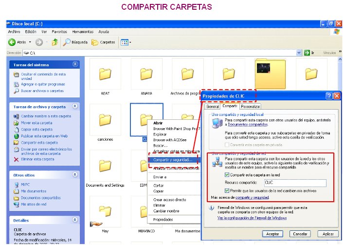1º- En primer lugar seleccionamos la carpeta, fichero o unidad que queremos compartir con el resto de la red. 2º- Hacemos clic con el botón derecho del ratón y seleccionamos compartir y seguridad. 3º- Seleccionamos la casilla de compartir esta carpeta en la red, se debe incluir el nombre del recurso compartido, así como permitir que los usuarios de la red cambien el contenido de los archivos si así se desea. Con esto queda preparada la carpeta para ser compartida. Para compartir archivos y unidades de opera de forma análoga. ![]() Compartir carpetas, ficheros y unidades en Windows XP | |