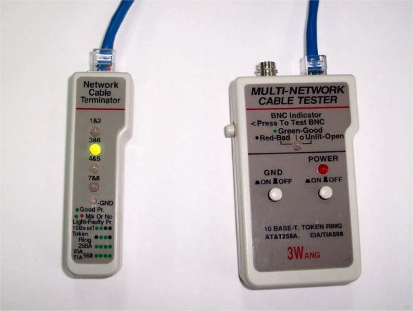 También existe un comprobador de cables que comprueba el conexionado del cable coaxial o de los pares trenzados sobre el conector RJ 45.