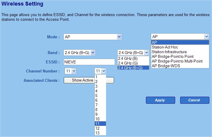 2º- Banda: puede trabajar con distintos formatos estándar de datos B , G o con los dos a la vez. 3º- ESSID: es el nombre de la Red inalámbrica debe ser igual para los distintos elementos que se conectan a la red. 4º- Canal número: Canal de emisión-recepción (debe ser igual en todas las estaciones y el router). 5º- Dispone de otras características de seguridad WEP, WAP, etc. También deben configurarse y almacenarse. ![]() Configuración de un Router-Wireless Con esto queda configurado el Router. | |