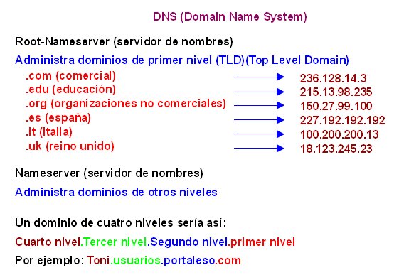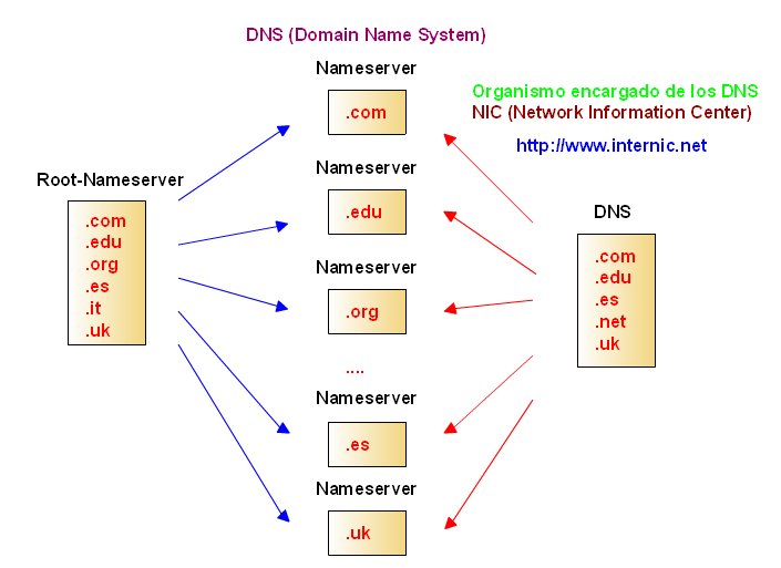 ![]() Estructura de los DNS El dominio de primer nivel, TLD (Top Level Domain) se administra por el Root-Nameserver, el organismo encargado de gestionarlo es el NIC (Network Information Center) http://www.internic.net .El Root-Nameserver conoce los servidores de nombres que se encargan de cada dominio. Una computadora de sobremesa debe conocer por lo menos la dirección IP de un servidor de nombres. Para que sea capaz de convertir nombres en IPs. Por lo general se asignan dos, por si hay problemas con la primera de ellas poder hacer la petición a la segunda. ![]() Servidores de nombres (Nameserver) | |