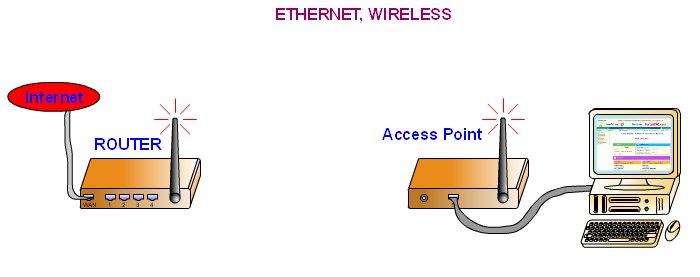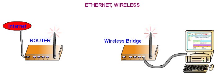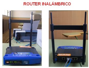 En la actualidad se han extendido mucho las redes inalámbricas. El Router además de las conexiones de RJ 45, dispone de una antena o dos, por la que se comunica con las estaciones inalámbricas. ![]() Router inalámbrico, trabajando como hub Las estaciones deben tener un punto de acceso cliente con el que recibir la señal. La mayoría de las estaciones tiene integrado este punto de acceso por lo que no es necesario el externo. ![]() Access point, aspecto conectado La conexión se realiza por radio frecuencia, el canal de conexión y las direcciones IP de las estaciones se pueden configurar en el Router. La distancia máxima que se alcanza en un ambiente cerrado es de 100 m, mientras que en exterior sin obstáculos puede llegar hasta 400 m o más. El ancho de banda es de 54 Mbps, menor que el de la red de pares trenzados, y puede dar cobertura a un número menor de estaciones. Existen varias configuraciones, según la distancia donde se encuentran las estaciones. Para distancias cortas se configura el Router como Punto de Acceso y las estaciones como Punto Acceso Cliente. ![]() Distancias cortas Cuando la distancia es mayor debemos colocar un repetidor para que la señal llegue hasta las estaciones. ![]() Distancias largas Si queremos alagar nuestra rede entre dos puntos alejados y la conexión inalámbrica se utiliza como sustituta de un cable, debemos configurar el router destino como un Bridge. ![]() La conexión inalámbrica sustituye al cable | |