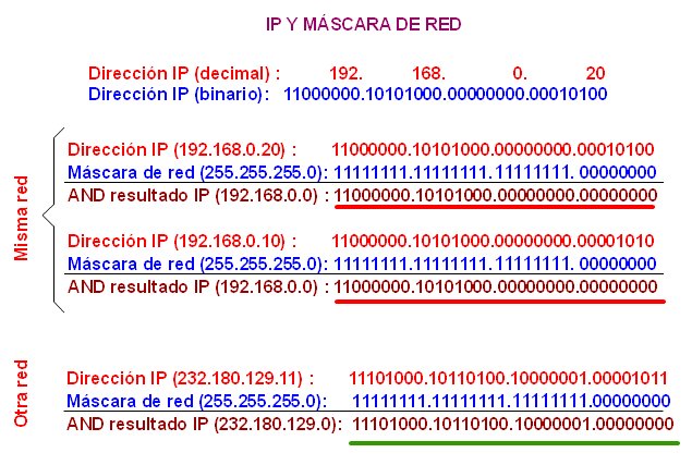 Simplificando, la máscara de (sub-)red define para una computadora lo que se encuentra "fuera" y "dentro" de la subred. Se puede acceder directamente a aquellas computadoras que se encuentren "dentro", mientras que a las que se encuentran "fuera" solo se llega mediante un enrutador (router) o una pasarela (gateway). Antes de enviar un paquete la computadora realiza la operación lógica Y, bit a bit entre la dirección de destino y la máscara, y la dirección origen y la máscara. Si el resultado es idéntico significa que la computadora remota se encuentra en la misma subred. | |||||||||||||