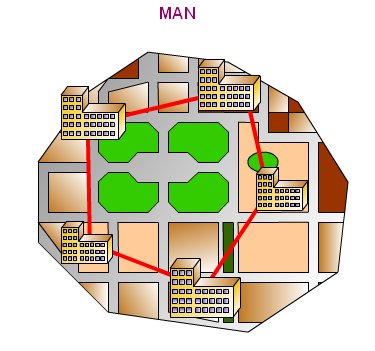 MAN (Metropolitan Area Network) Son redes de mayor extensión, dan servicio a múltiples usuarios, se extiende dentro del área metropolitana. | |