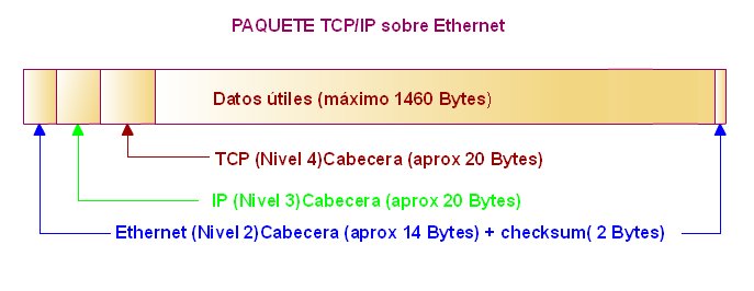 ![]() Paquete TCP/IP sobre Ethernet Como se puede observar el máximo útil de datos a transmitir en un paquete en una red Ethernet es de 1460 Bytes. | |