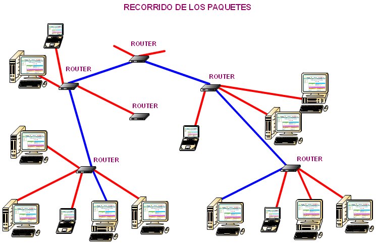 Cuando una estación hace una petición o envío de datos a otra, la petición llega hasta el Router, la primera vez el Router no sabe donde se encuentra la estación de destino por lo que la envía por todos los terminales y espera la confirmación de cual es el camino correcto. Este proceso se repite de un Router a otro. Cuando los paquetes llegan hasta un Hub o un Swich estos los envían por el resto de terminales y no esperan la confirmación de cual es el camino correcto. Una vez llega la petición hasta la estación correcta, esta devuelve la confirmación del camino, y el router anota el camino. El Router es inteligente y almacena el recorrido que deben realizar los paquetes, de manera que la próxima vez podrá dirigir los paquetes por el camino correcto. ![]() Recorrido de los paquetes de una estación a otra | |
