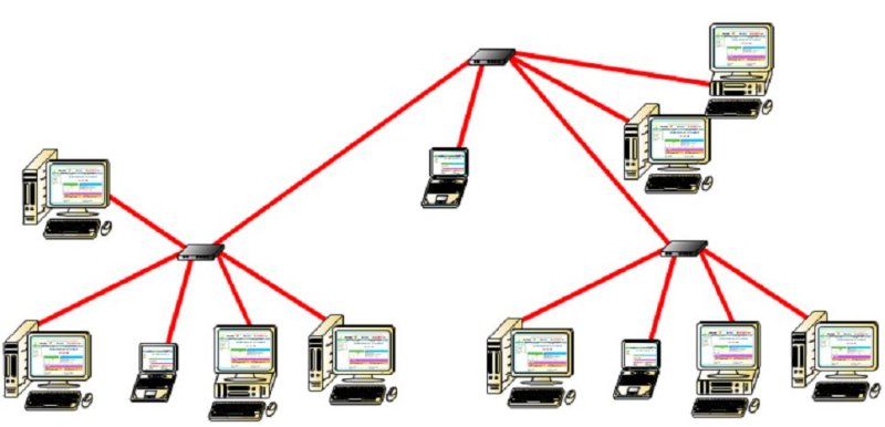 Topología en Árbol La topología en árbol aparece como desarrollo de la interconexión de varias topologías en estrella. | |